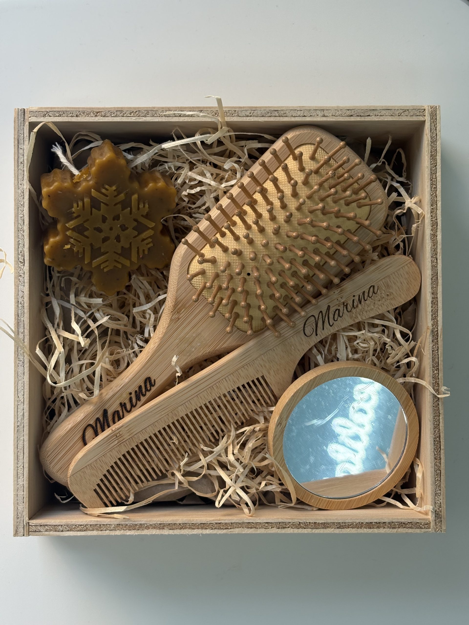 Para los más presumidos un detalle que va a enamorar a primera vista, una cajita de madera personalizada con productos personalizados para el cuidado y mimo propio.La cajita de madera de 20x20cm cuenta con tapa personalizada, en su interior; un espejo, cepillo y peine de madera personalizados, y una vela artesanal de miel con un toque navideño.Realizamos envíos a toda la península (Almería, Cádiz, Córdoba, Granada, Huelva, Jaén Málaga, Sevilla, Huesca, Teruel, Zaragoza, Asturias, Cantabria, Albacete, Ciudad Real, Cuenca, Guadalajara, Toledo, León, Ávila, Burgos, León Palencia, Salamanca, Segovia, Soria, Valladolid, Zamora, Barcelona, Girona, Lleida, Tarragona, Badajoz, Cáceres, Galicia, A Coruña, Lugo Ourense, Pontevedra, Madrid, Madrid, Murcia, Navarra/Nafarroa, La Rioja, Alicante, Castellón, Valencia, Álava, Guipúzcoa, Vizcaya).