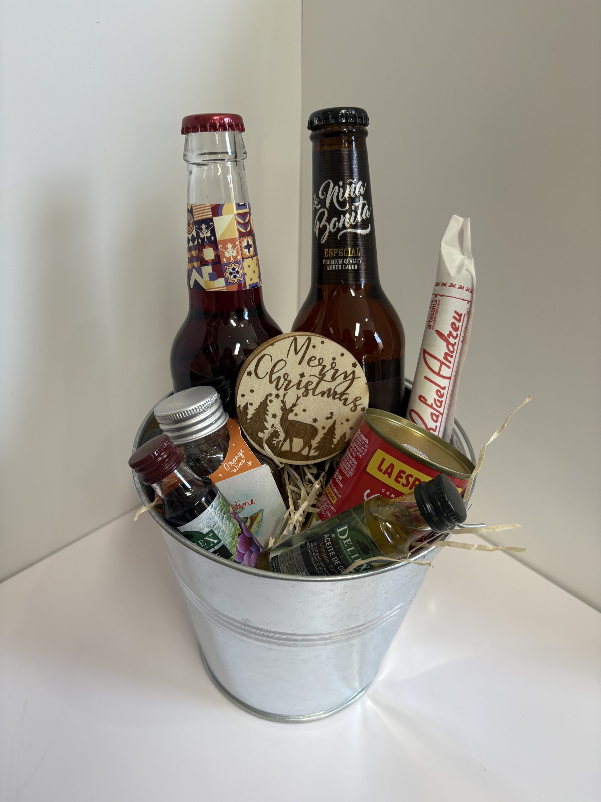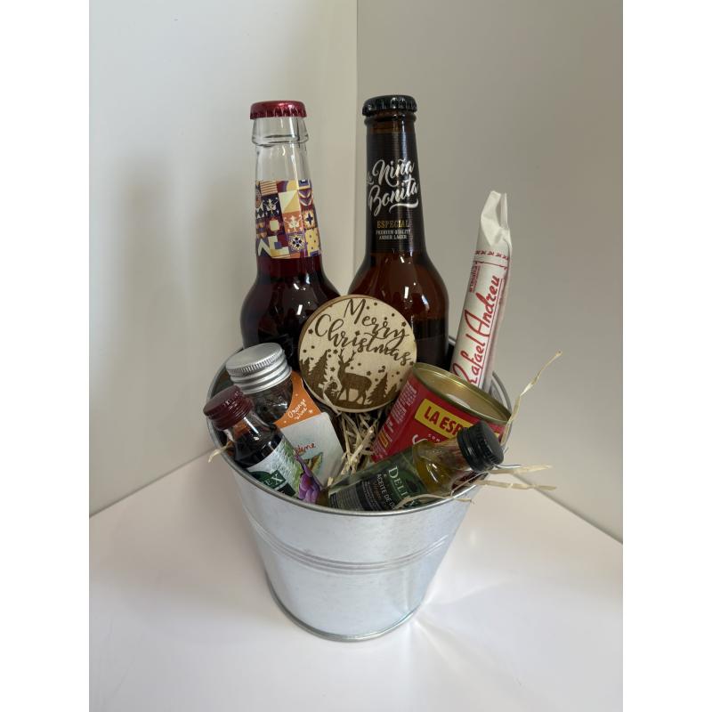 ¿Quieres algo todavía más original para estas Navidades? Pasa de la cajita de madera al cubilete metálico, ideal para el refrigerio de las bebidas para estas fiestas.En su interior podrás encontrar un selecto surtido de productos. 1 cerveza artesanal "La niña bonita", 1 tinto de verano "La señera", un vino de naranja, un bollo Andreu artesano, unas aceitunas, un aceite y vinagre de Módena "Deliex" 25ml, y para el permanente recuerdo un abridor de madera con imán navideño.Realizamos envíos a toda la península (Almería, Cádiz, Córdoba, Granada, Huelva, Jaén Málaga, Sevilla, Huesca, Teruel, Zaragoza, Asturias, Cantabria, Albacete, Ciudad Real, Cuenca, Guadalajara, Toledo, León, Ávila, Burgos, León Palencia, Salamanca, Segovia, Soria, Valladolid, Zamora, Barcelona, Girona, Lleida, Tarragona, Badajoz, Cáceres, Galicia, A Coruña, Lugo Ourense, Pontevedra, Madrid, Madrid, Murcia, Navarra/Nafarroa, La Rioja, Alicante, Castellón, Valencia, Álava, Guipúzcoa, Vizcaya).
