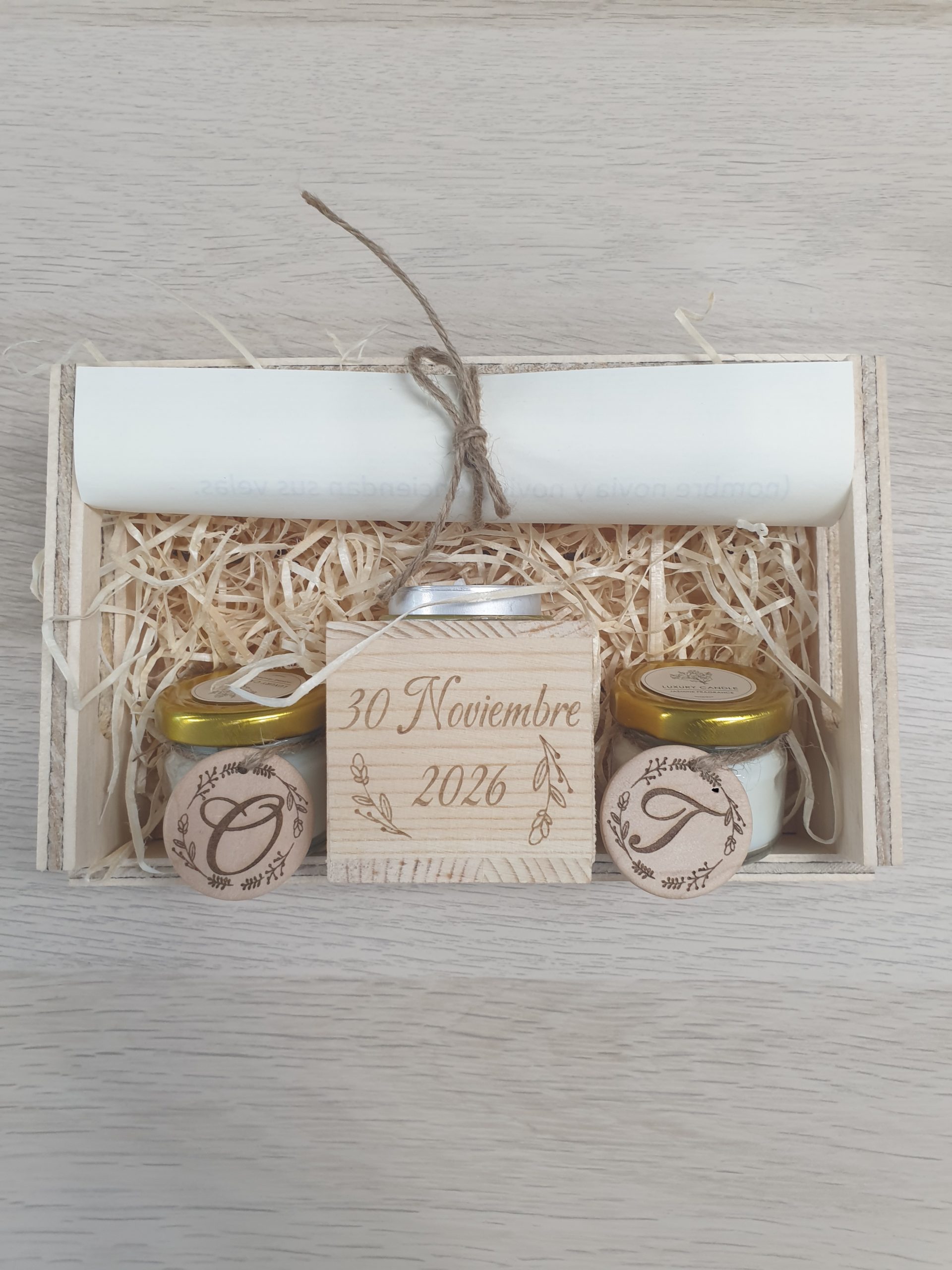 Cada vez son más las parejas que realizan rituales en su boda, sobre todo en las civiles: de la arena, de la rosa...y como no de la luz, si bien esta también se realiza en ceremonias religiosas.Hemos pensado que este nuevo modelo con dos velitas de cristal personalizadas que se unen en la del centro de madera con pergamino sobre el ritual sería un recuerdo precioso para ese día.En la parte posterior de la caja, podéis añadir una frase que sea sólo vuestra o que diga algo de vosotros para ese momento tan especial.En el precio está incluido el envoltorio y los grabados.Realizamos envíos a toda la península (Almería, Cádiz, Córdoba, Granada, Huelva, Jaén Málaga, Sevilla, Huesca, Teruel, Zaragoza, Asturias, Cantabria, Albacete, Ciudad Real, Cuenca, Guadalajara, Toledo, León, Ávila, Burgos, León Palencia, Salamanca, Segovia, Soria, Valladolid, Zamora, Barcelona, Girona, Lleida, Tarragona, Badajoz, Cáceres, Galicia, A Coruña, Lugo Ourense, Pontevedra, Madrid, Madrid, Murcia, Navarra/Nafarroa, La Rioja, Alicante, Castellón, Valencia, Álava, Guipúzcoa, Vizcaya)